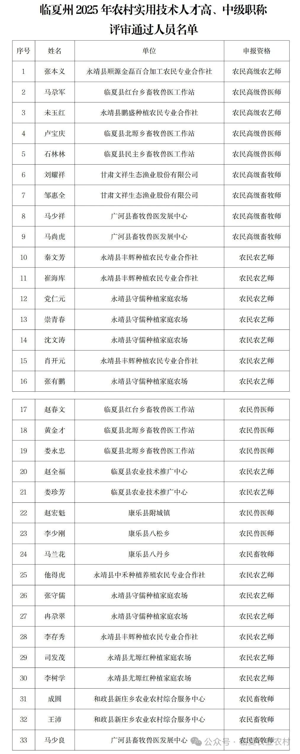 附:临夏州2025年农村实用技术人才高、中级职称评审通过人员名单