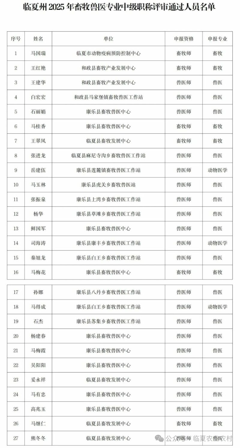 经临夏州畜牧兽医专业中级职称评审委员会于2025年12月13日评审通过,马国瑞等27名同志具备畜牧兽医专业中级职称资格,现将通过评审人员名单予以公示,接受广大干部群众监督,公示期为2025年12月15日—19日,共5个工作日。