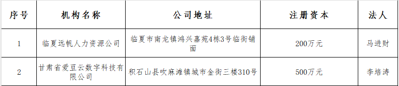 按照《劳务派遣行政许可实施办法》(中华人民共和国人力资源和社会保障部令第19号)和《甘肃省劳务派遣行政许可实施细则》(甘人社通〔2015〕253号)文件规定,我局受理临夏远帆人力资源公司、甘肃省爱豆云数字科技有限公司提交的劳务派遣经营许可申请。经审核,符合劳务派遣资质,拟批准劳务派遣经营许可,现予以公示。