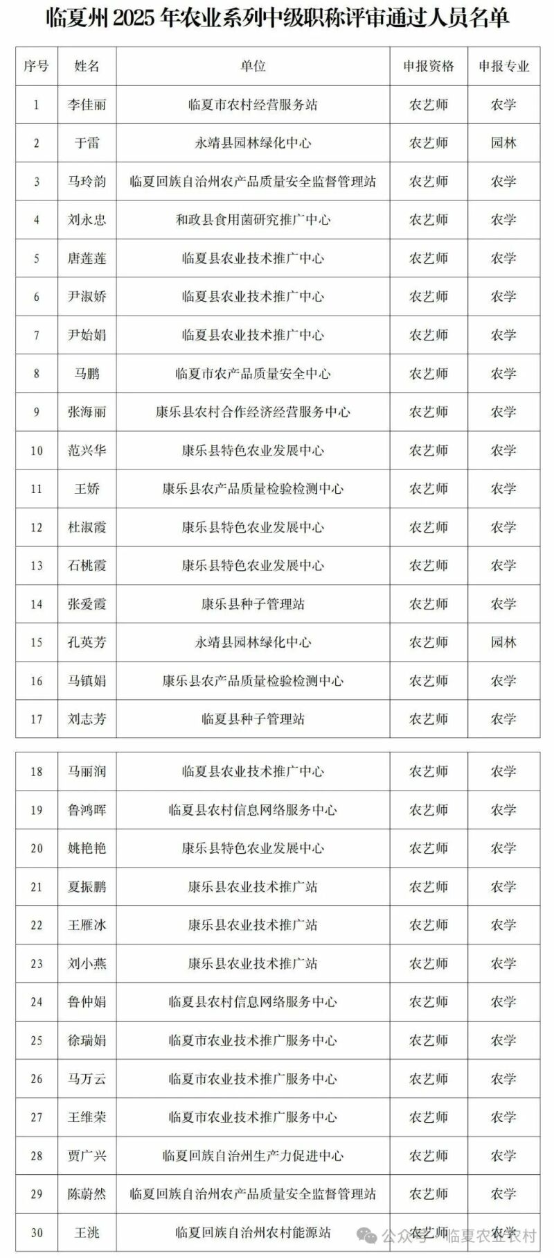 附:临夏州2025年农业系列中级职称评审通过人员名单