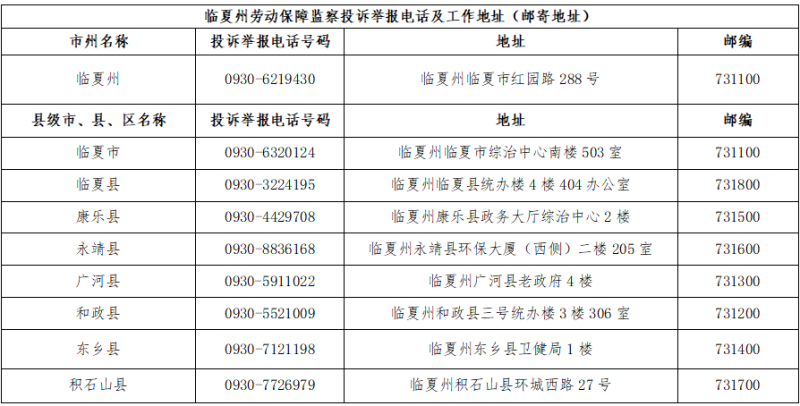 方式二:可到务工所在地的劳动保障监察机构进行投诉,也可直接拨打以下电话进行举报投诉。
