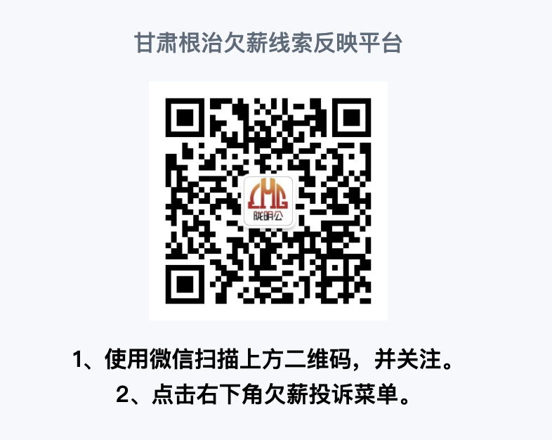 方式一:通过手机扫描二维码或通过微信搜索“陇明公”公众号,随时随地提交欠薪线索,不受时间和地域限制。平台收到欠薪问题线索后,将自动流转至欠薪地人社部门进行核实处理,农民工可以实时查询已提交线索的办理进展情况。