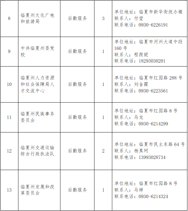 5.联系电话:各机关事业单位联系电话(详见临夏州本级2026年第一批公益性岗位需求表)