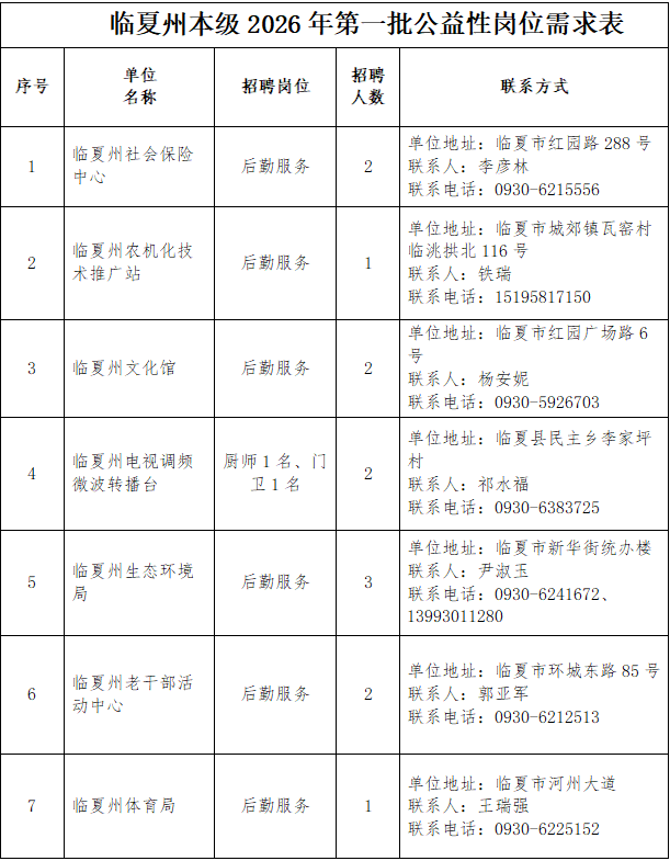 4.联系人:各机关事业单位联系人(详见临夏州本级2026年第一批公益性岗位需求表)