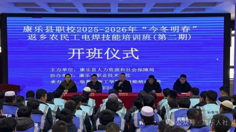 1月26日,康乐县2025——2026年“今冬明春”返乡农民工电焊技能培训班第二期在县职校开班,将免费技能培训送至群众家门口,助力稳就业、促振兴。县人社局党组书记、局长杜正辉,县职校校长白学强,拉萨市电焊行业协会相关负责人马志孝,临夏利新工学培训学校校长赵莉莉,参训学员120人参加开班仪式。