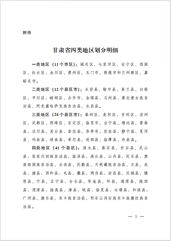 一类地区(15个):嘉峪关市、城关区、七里河区、安宁区、西固区、红古区、金川区、肃州区、玉门市、敦煌市、白银区、崆峒区、西峰区、凉州区、兰州新区。